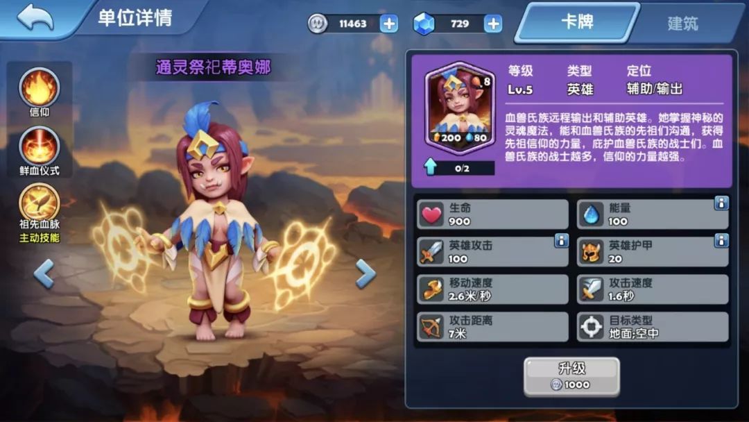 优先召唤新英雄通灵祭祀,这个新英雄相当强力,增加兽族上场率的原因就是因为新英雄的出现。通灵祭祀在战斗中能量回复是相当快的,一般一场战斗都能放出两次大招。