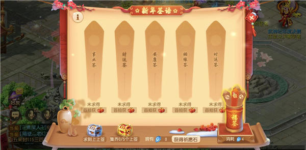 你的2020年会是怎么样?现在,《梦幻西游》手游将为你解答。从即日起至1月5日,等级≥40级的玩家只需活跃度达到60、80、100,或是完成每日指定任务即可获得祈愿石,而消耗4个祈愿石,玩家即可进行一次求签,探寻自己的新年运势。如果玩家抽出中上签,即可使用祈愿石再次求签,而若是抽出上上签,则可以将其收入珍宝阁之中珍藏起来。