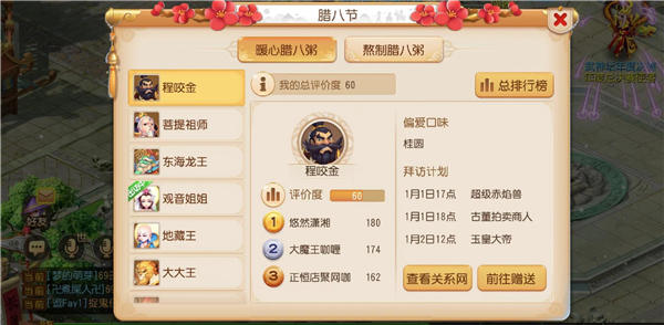 除了完成李知味派发的任务外,玩家还能通过各种日常任务来获取食材制作腊八粥,并将腊八粥赠送给游戏中的NPC,以提升他们对自己的评价度。每天评价度排名靠前的玩家,还能获得特殊称谓奖励。