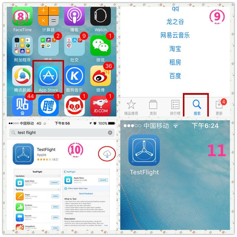 激活成功后,打开iPhone上的App Store软件,选择“搜索”栏目,输入“TestFlight”进行搜索,并下载软件。下载完成后请耐心等待官方的邀请邮件。