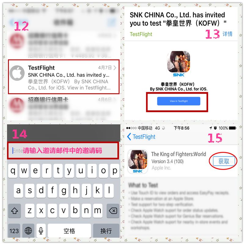 已经获得激活码的用户,请前往官网:http://kofw.snkchina.com.cn/event/mediatfnum/激活激活码。4月16号24点前激活成功的玩家,将在4月17号12点左右收到邀请邮件(收到邀请邮件的用户可提前下载TF测试客户端);4月17号24点前激活成功的玩家,将在4月18号开服前收到邀请邮件。(建议各位玩家在16号24点前激活激活码,以便第一时间下载游戏测试客户端)