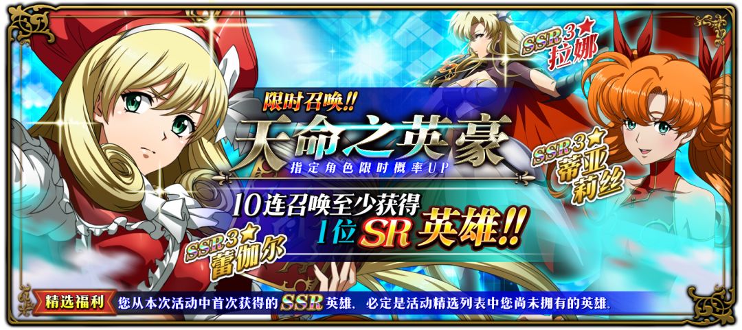 限时召唤「天命之英豪」中SSR级英雄拉娜、蒂亚莉丝、蕾伽尔出现概率提升!