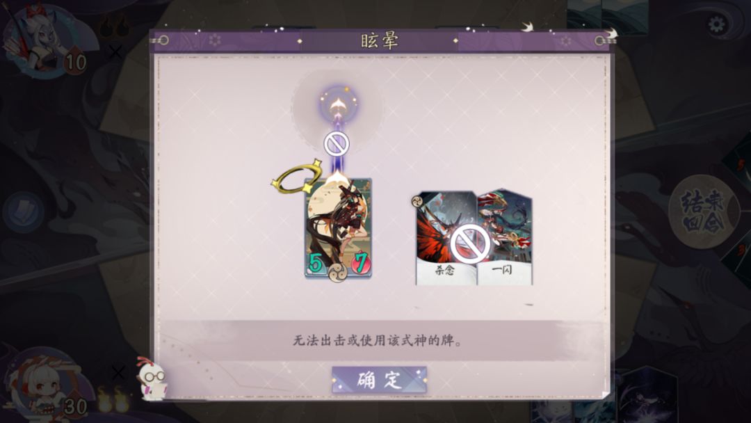 2、若是牌手被“眩晕”,则无法拖动式神进入战斗区,持续一回合,也就意味着我们牌手将完全暴露在敌人面前,没有式神在战斗区为我们抵挡伤害。式神无法出击就会让我们少去很多输出,所以我们要尽可能避免被敌方“眩晕”住我们的牌手。