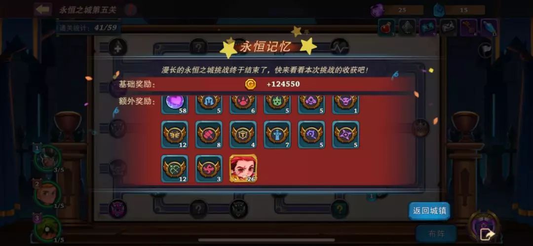 首先上大佬的奖励图( ̄▽ ̄)/只要会打了永恒之城,我们就再也不用担心金币不够用了,而且丰厚的碎片可以让我们的红莲快速升星,成为我们手中强大的助力,同时丰富的羁绊材料也能让我们阵容的羁绊效果更加强大。