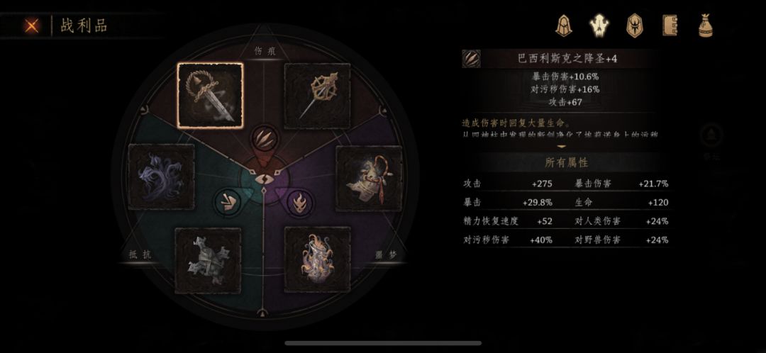 现在比较一下父爱(污秽)+狂沙(人类)+陶片(攻击)和降圣(攻击)+胸针(攻击)+陶片(攻击)这两套装备。从泰伦斯的数据上看,前者764.046385,后者779.378605,其实这两者差距不大。再分析一下其他数据,泰伦斯的暴击前者23.8%,后者33.8%,后者的暴击比前者高了10%,然而暴击这个东西毕竟看脸,所以其实前者的输出可以说更为稳定一些。再看看伤害加成类型的分布前者是人:43%,污:27%,兽:12%;而后者是人:24%,污:40%,兽:24%。我们回顾一下怪物类型分布:只属于人:10,只属于兽:3,只属于污:4,同属污人:4,同属污兽:1。这么一对比就应该能够发现,其实前者的伤害加成类型的分布更为合理一些。最后再谈谈这两者的自残程度,这里没有测试数据但是在游戏里实测可以得出:降圣回血=胸针扣血,这样一来前者的扣血量=陶片的扣血量-父爱的回血量,而后者的扣血量=陶片的扣血量。这说明前者的自残程度是要小于后者的。