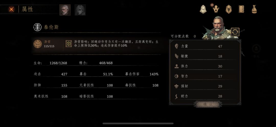 4、角色等级99,泰伦斯力量点了47点,敏捷点了18点,力量再多的点数后面收益较低影响也小;维奥拉敏捷点了47点,力量点了18点。暂时按这个来。