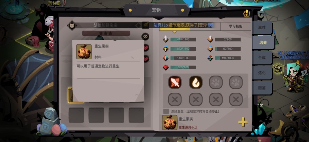 3、变异之后的培养主要是重生重新生成资质和技能,以及技能培养。免费玩家建议是追求变异宠物,有多技能的最好。对有一定付费能力的玩家建议先重生追求变异宠物资质,后面再手动学习技能追求多技能。