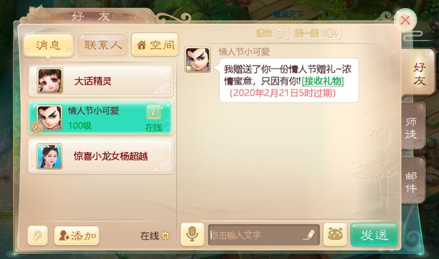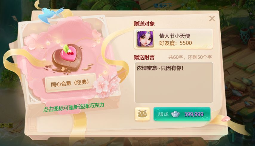 赠送巧克力不仅可以增加好友之间的友好度,夫妻还可以获得双倍友好度。此外,巧克力还可以增加受赠者的空间人气度,部分需要消耗银两或仙玉的巧克力款式和颜色还可以提高受赠者获得的人气度奖励哦!