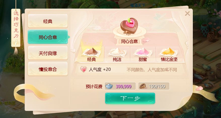 玩家在“情缘物语”玩法中获得的“可可豆”道具,是用于浓情蜜意赠礼活动的材料。在活动期间,玩家通过“情缘物语”活动和日常活跃度奖励可以获得总计100个可可豆材料。玩家在游戏中找到对应NPC,消耗100个可可豆就可以制作一份巧克力,赠送给自己的好友。在制作礼物的过程中,玩家可以自由选择巧克力的款式,颜色,还可以给好友留言,帮助大家表白自己的心意。