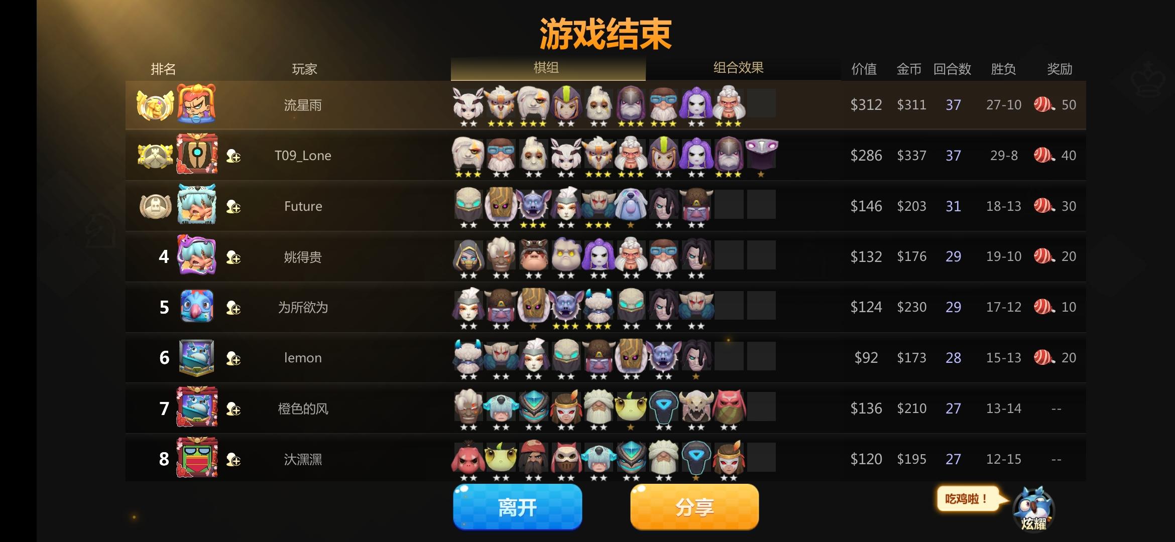 最后决赛2家精灵猎,我天崩连败只能玩德了,玩着玩着一看一楼冒黄光天胡德,心态爆炸,7人口只能死命D牌了,没想到D出个3星火枪,还多了2个瞬间变爸爸卡一楼火枪,楼下几家最后装备还给的可以海妖有回蓝,火枪有2疯脸一个重棍,活活把一楼抬走。