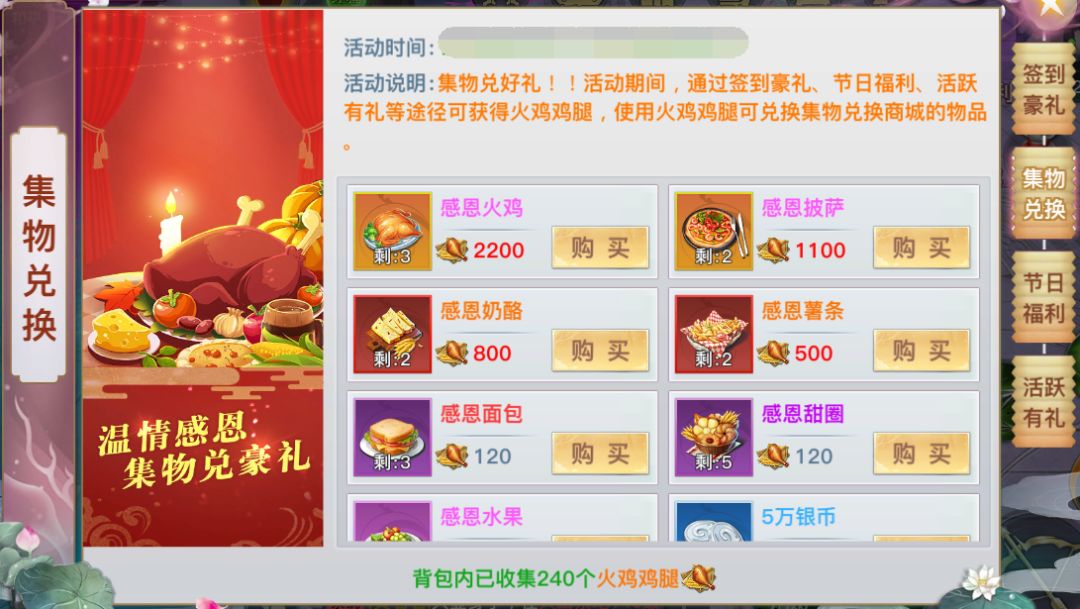 感恩节活动期间,参与活动可获得火鸡鸡腿,使用火鸡鸡腿可兑换【集物兑换】商城的物品。