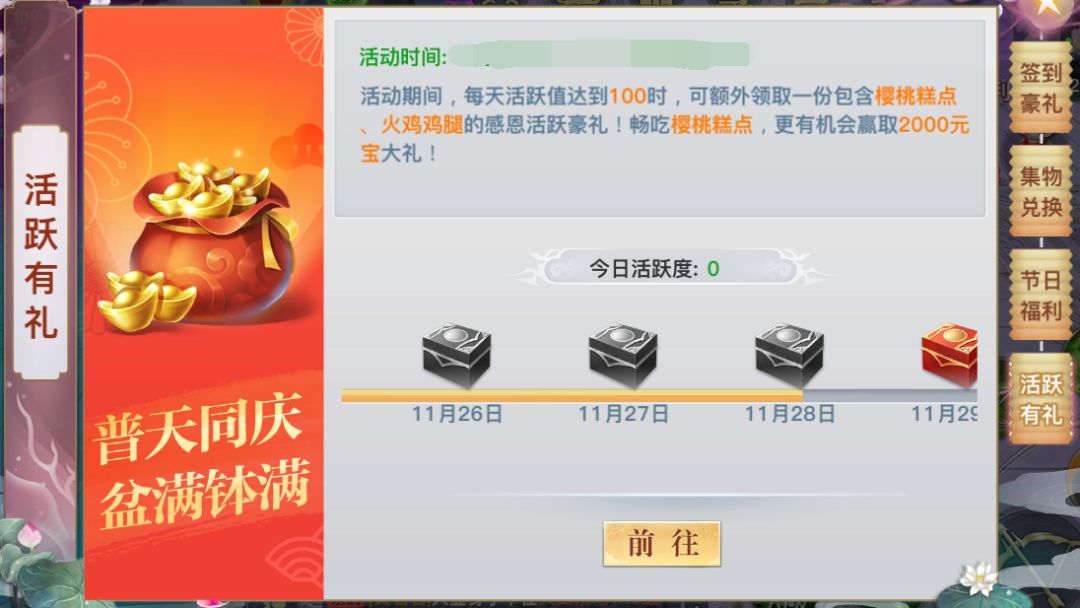 活动期间,每天活跃值达到100,可额外领取一份包含樱桃糕点*1、火鸡鸡腿*60的感恩活跃豪礼!畅吃樱桃糕点,更有机会赢取2000元宝大礼!多重福利 感恩回馈