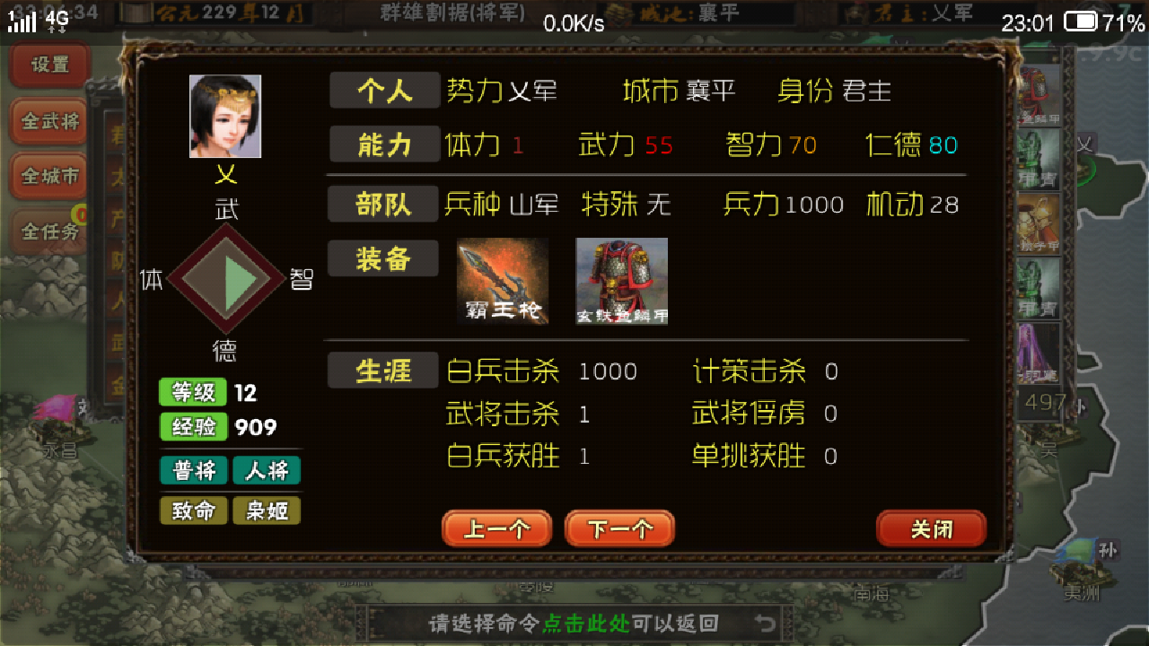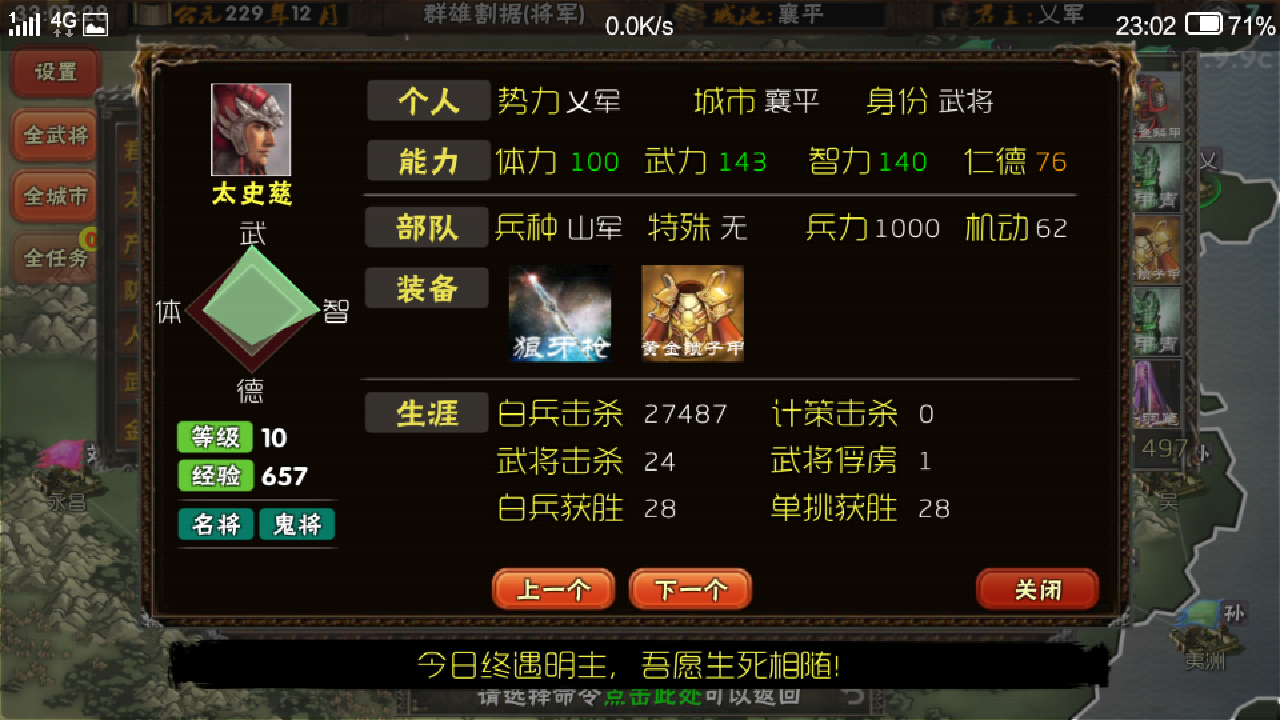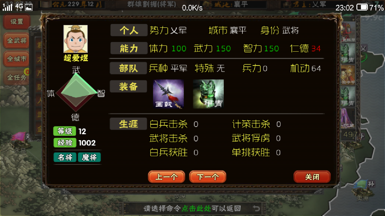 本来前面蘑菇玩的就已经变身魔将了,后来发现神器可以无限刷。强迫症犯了,又去玩前面的存档打超哥刷神器。超哥一个光棍在城里,所以就派太史慈一个人去怼他。运气爆棚太史慈一个平砍84点体力,超哥还剩16点体力就喊英雄了。前面也看过抓超哥的攻略感觉很麻烦,万万没想到就这样得手了。体验了一下超哥没技能前期爽歪歪,后期打有技能鬼将比较吃力。还好有个自带的特效,要不然跟满级的太史慈没差别。这下蘑菇长不大了!只能放生让她去玩泥巴好了。