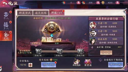 玩家在跨服1V1中和随机匹配到的对手战斗,获胜后可获得积分,累计积分可提升段位、排名、功勋,获得相应的每日奖励(荣誉值),赛季奖励(铜钱,绑玉,魂器强化材料,羽翼强化材料),功勋奖励(经验、绑玉、铜钱、长生水晶)。