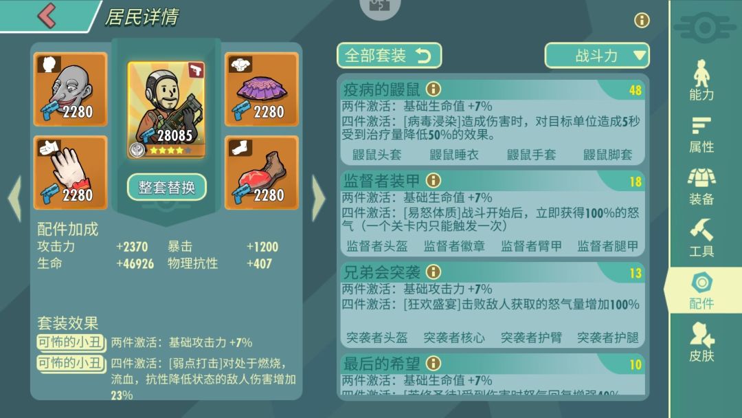 丹斯的配件为小丑,这里说明一下为什么不要突袭,突袭杀人后需要有一枪的间隔才会放第二个大招,而丹斯在未有突袭的情况下需要两次即可释放第二次打招,突袭对丹斯提升不大,而且突袭后的丹斯和圣父大招的时间线基本吻合,容易一枪打在圣父的盾上,十分尴尬。同时在后期血量提升的情况下,丹斯基本做不到在未有加成的情况下一枪秒人。所以我的建议是放弃突袭。后期小丑套装配合沙拉及长老基本能做到一枪一个,保证杀人的稳定性,小丑加上科技加成,能有30%伤害的加成,十分恐怖。小丑套配件属性(生命>攻击>其他),作为队伍的主攻手,生存是保证输出的唯一前提。而且国家队的丹斯根本不缺攻击,沙拉长老都能提供大量攻击加成,我的丹斯血量排在壮壮之后,确保生存无忧。