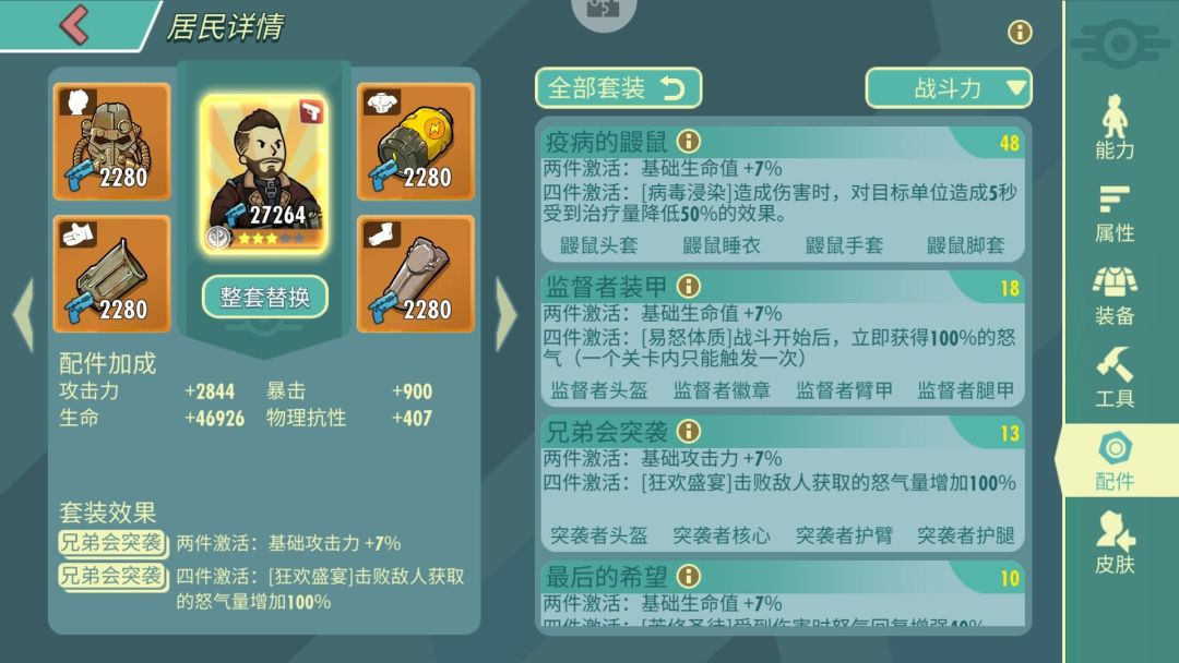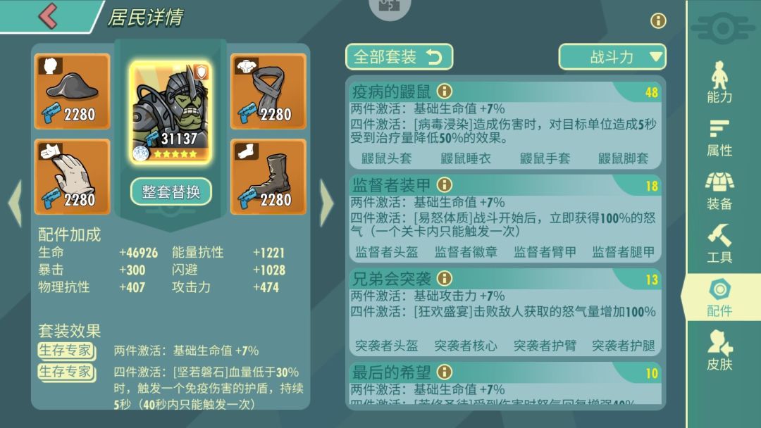 壮壮配件应该带生存,配件属性词条(闪避>生命>能抗>其他),也就是说配件以闪避和血量为优先,能抗能忍,其他的全是垃圾属性。目前的物理英雄强势的就是丹斯,他还是一个靠技能吃饭的狙击手,所以就目前的版本而言,前排物抗几乎没有用武之地,高闪避可以很好地克制废土阵容,血量又可以和壮壮本身的天赋完美搭配,十分的契合。