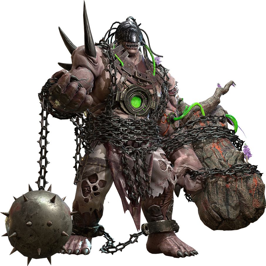 反常的自然现象,滔天巨兽的恐怖嘶吼……一只如同人类恐惧情绪中存在的怪兽从百慕大里走了出来。一身健硕无比的肌肉遒劲有力,从尾椎骨长出的精金锁链缠绕在身上,最终在右手形成一颗流星锤,左手绑着一棵巨大的紫色枝干,上面有着一颗颗食人花的种子,脱离枝干后会迅速成长至成熟期,对周围的生命体发起攻击。胸口中心的绿色指示灯有着召唤雷暴的能力,这是个十分强大的群体技能。头颅上戴着一个钢铁面具,面具下是一只巨大的独眼,是由许多复眼组成,因此这个怪物拥有十分优秀的动态视力。