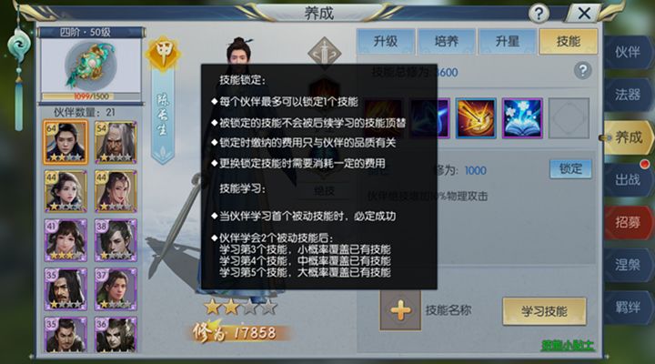 2、在技能学习的时候,从第二个技能的学习开始,就有概率覆盖之前学习过的技能,建议玩家先学习低级技能,将五个技能栏都开启之后,再学习中级技能或者高级技能进行覆盖。对于高级技能,我们还可以使用灵玉将其锁定,防止后来的技能学习将其覆盖。
