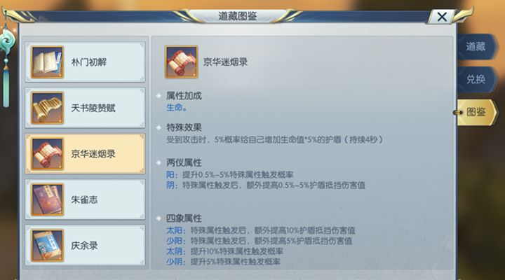 京华迷烟录:提升玩家的生命值,并且在玩家受到攻击时,有概率给自身增加一个生命值5%的护盾。