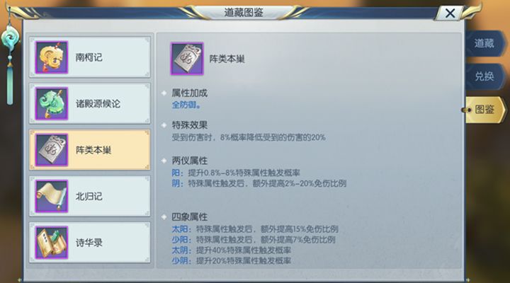 以上就是道藏中阵类本巢和京华迷烟录的介绍了,通过这两本道藏的佩戴,玩家的防御能力以及修为能力肯定能够得到进一步的提升。更多精彩内容请继续关注择天记手游。