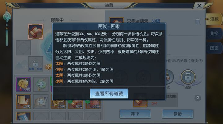 这两本道藏是建议槐院和青曜十三司都进行佩戴的,而且如果想进一步提升它们对自身的收益的话,我们还可以对其进行提升。通过使用灵气对道藏进行炼化可以提升道藏属性,而且达到一定的级数还可以直接对道藏进行参悟,参悟可以进一步提升道藏的特殊效果触发的几率或者触发时效果的能力。