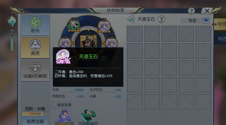 天道玉石4件套(5级)效果:暴击+250,造成暴击时,伤害+35%。