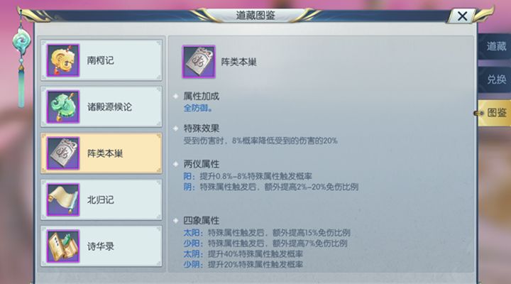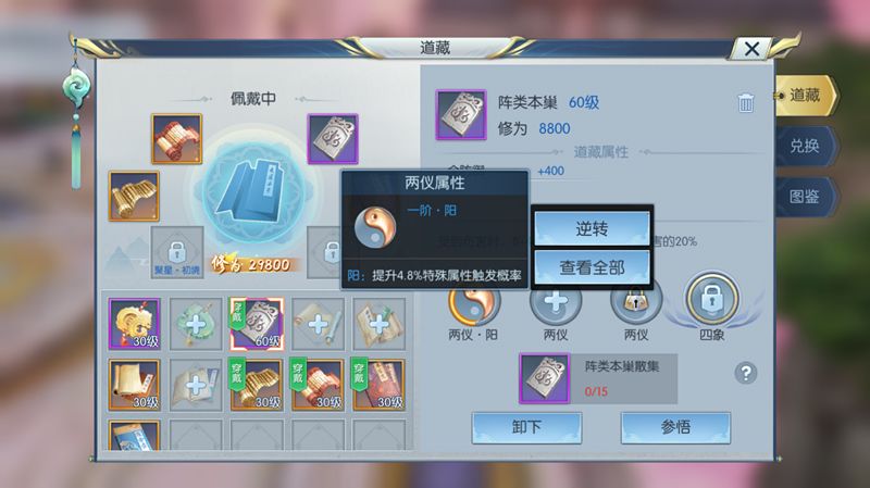 想要提升阵类本巢对玩家的增益效果,一开始我们可以使用灵气提升道藏的等级,相应的提升道藏基本属性的提升,道藏达到一定等级我们还可以对其进行参悟,使其获得两仪和四象属性。槐院的两仪属性推荐是选择阴,因为槐院被集火的时候触发的效果还是很高的。这时候选择提高免伤比例收益会更高一些。