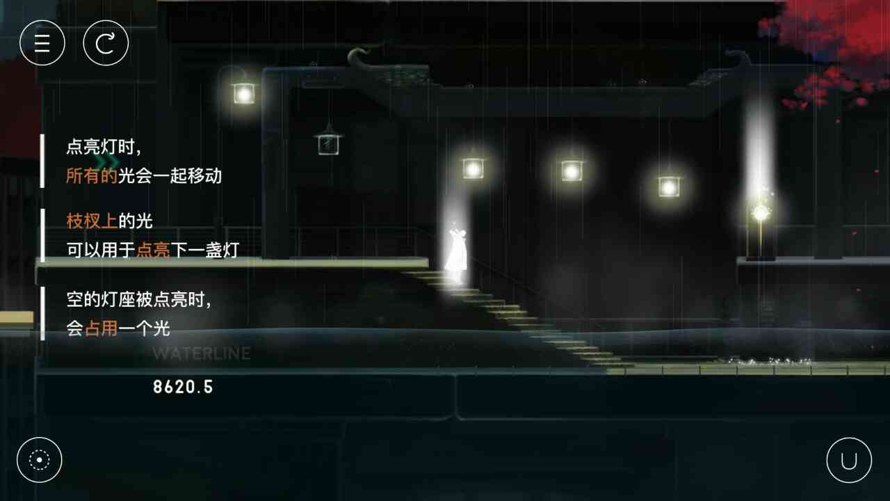 随着引导提示,我看到了那仅存的一道路灯。那就是本游戏的精髓了。所有的操作都是围绕路灯上的光源所进行的。我们需要的是按住U把光源吸到自己身上,然后再把集合在身上的小光源点亮到每一盏灯上。游戏玩法基本是一点就通。
