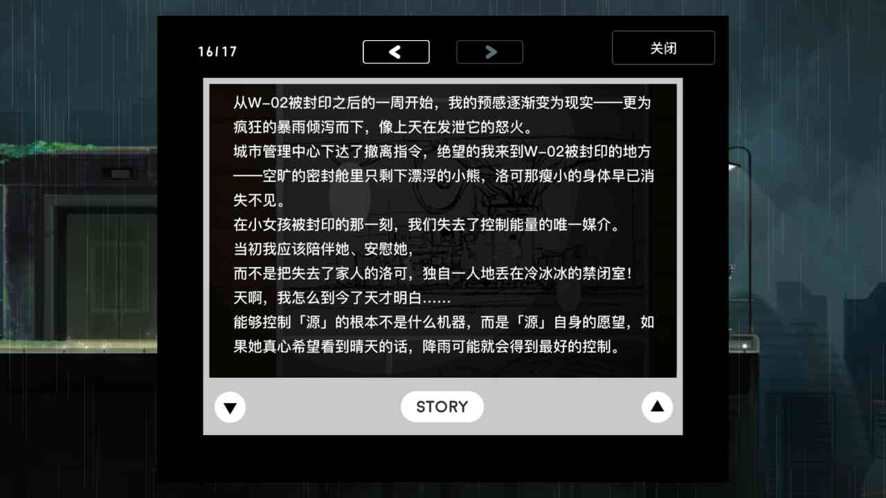 在我第一次玩到这个游戏,的确是被这世界观所吸引。一个披着雨衣的女孩指引着我来到这座被雨水淹没的城市。我很好奇,这座城市发生了什么事情?