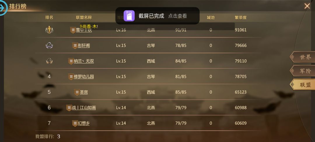 本联盟成员多数为第一次玩全战天下,开荒之初非常吃力,没有攻略,我们只有slg游戏的经验,本公会是一个成立了5年的老牌公会,不强大,但是我们很团结,参与的每一款slg游戏都能玩出自己的道路,本次测试公会参与了30号人,经过俩天摸索,我们在游戏中结交了更多的朋友,以下是本人对游戏的记录,昨天第一天开荒太忙没有更多截图,就说一说了,第一天白天本联盟在西域默默无名,到晚上时已经稍微露头,到第二天个人榜第一名被本联盟霸占,联盟排名稳定在前五,本人在西域发展的还不错,个人长期在前20,周围没有多少竞争对手,发展顺利期待后续攻城战