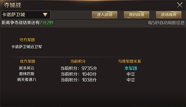 2.比赛期间某个军团临时占领某个城市时,军团成员在其他城市的杀死积分怪无积分奖励。所以,军团长官一定要在战前动员时强调好目标城市。