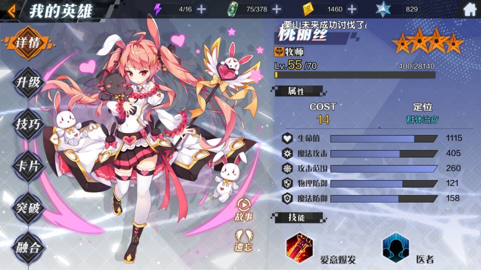 初期角色中最好用的奶妈,技巧一技能每三次回复触发一次群体回复。
