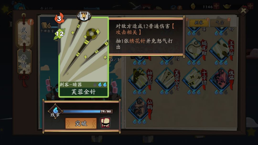 然后建议,选一个武侠,化形初始绣花针替换为龙须针。这样刺客前期就加强了。也不会太变态。毕竟初始5张卡,4张绣花针1张龙须也秒不了人,但是手感舒服,快乐!