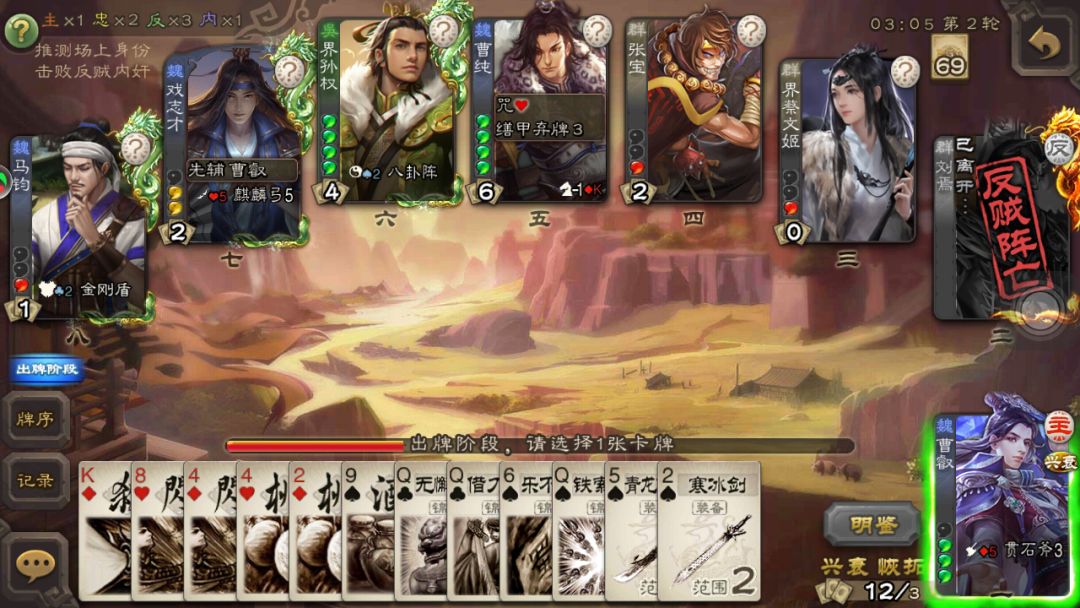 此时此刻,我是这么想的:界蔡文姬死忠、戏志才忠臣的可能性更大,由于张宝技能比较克制我的原因,是反的可能性更大(但好像不会玩)。对于曹纯,因为帮刘焉出过桃,所以死反。而马钧给曹纯补过牌,所以也是死反。而界孙权因为杀过戏志才,所以大概率也是反。