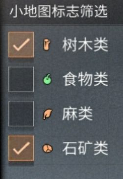 资源标记:在小地图的左侧有“树林、石头、麻、果实”等资源的选项