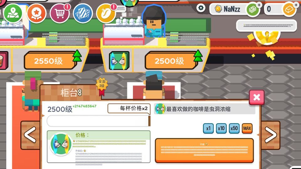 2数据过大后有负数而后柜台消失。而且你开发者这个咖啡价格居然用的有符号整形,我钱是无限大的时候升级咖啡柜台居然成-xxxxxxxxx级,然后柜台消失,咖啡价格也是负的,把所有数据都设置成无符号整形把,而且用科学计数就不用那么多0了,我估计后面价格数据有100多个0了。