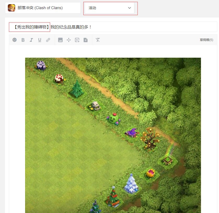 1、在“部落冲突CN”发布帖子,帖子以 “【秀出我的障碍物】XXXXX” 为标题,“XXXXX”为帖子主题,请首领自行编辑。帖子内容必须至少分享一张游戏纪念品(纪念障碍物)截图,否则为无效参与贴。