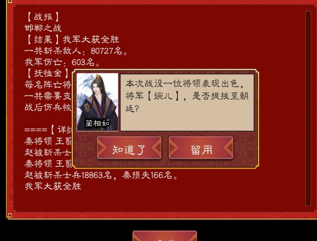 一点一点地喂着属性,幸好刺客给我送了加珍宝的buff,婉儿终于在后续的战役中派上了用场,经历了三个月的鏖战,成功攻下齐都,变成了近臣。