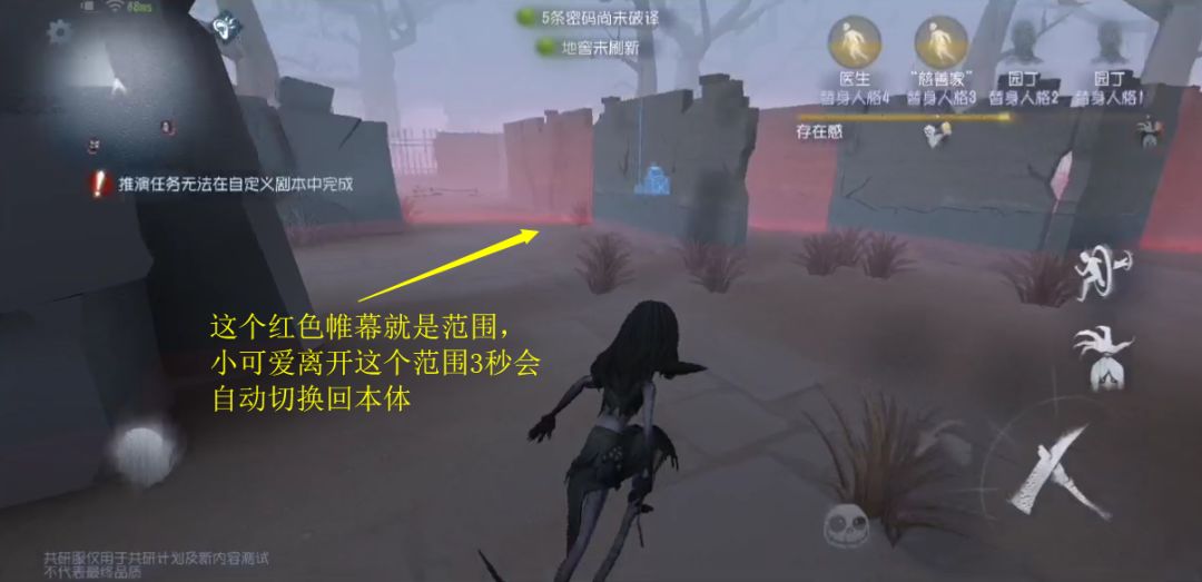 其次注意:二技能开了之后,小可爱移动范围区域变大,小可爱和本体是可以同时用两个或者两个以上的传送、狗(目前共研服有BUG)、失常、等特质