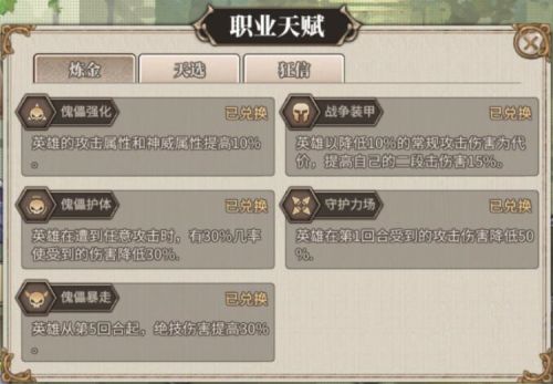 12. 职业天赋:天启后的英雄将开启一个职业天赋槽,通过荣誉点兑换天赋后,可为指定的职业英雄进行天赋佩戴。天启成功的英雄还可以通过消耗两张同品质的英雄碎片额外解锁一个天赋槽,下面为当前版本职业天赋一览: