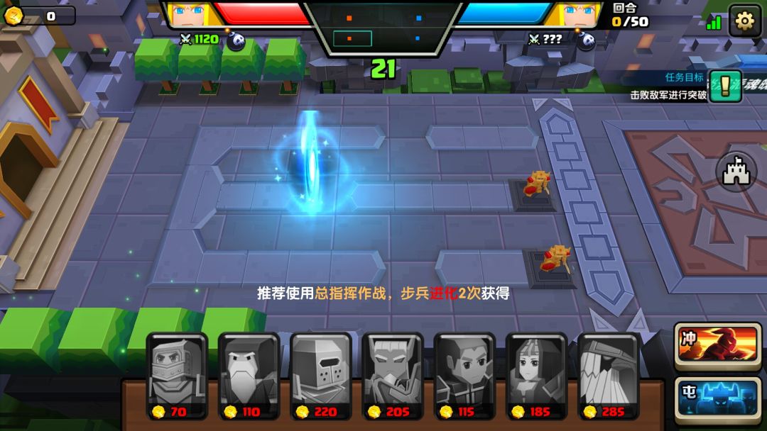如图,这关是教你分秒必争,后面有几个关卡是分秒必争的,与玩家对战时快到传送门了离下一波兵还有几秒钟(这时候敌人兵已经没了),用冲锋部队会快速进传送门打战神。