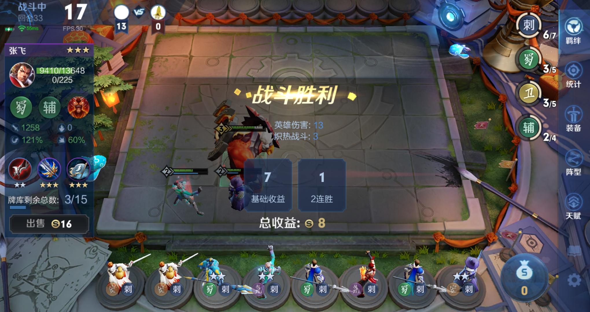 最后我和另一个蜀刺还有个法刺,3星张飞没出之前给法刺融化了,李白和老虎都差1个3星然后赌出了张飞30回合给了个旗子和破军,吃🐔了