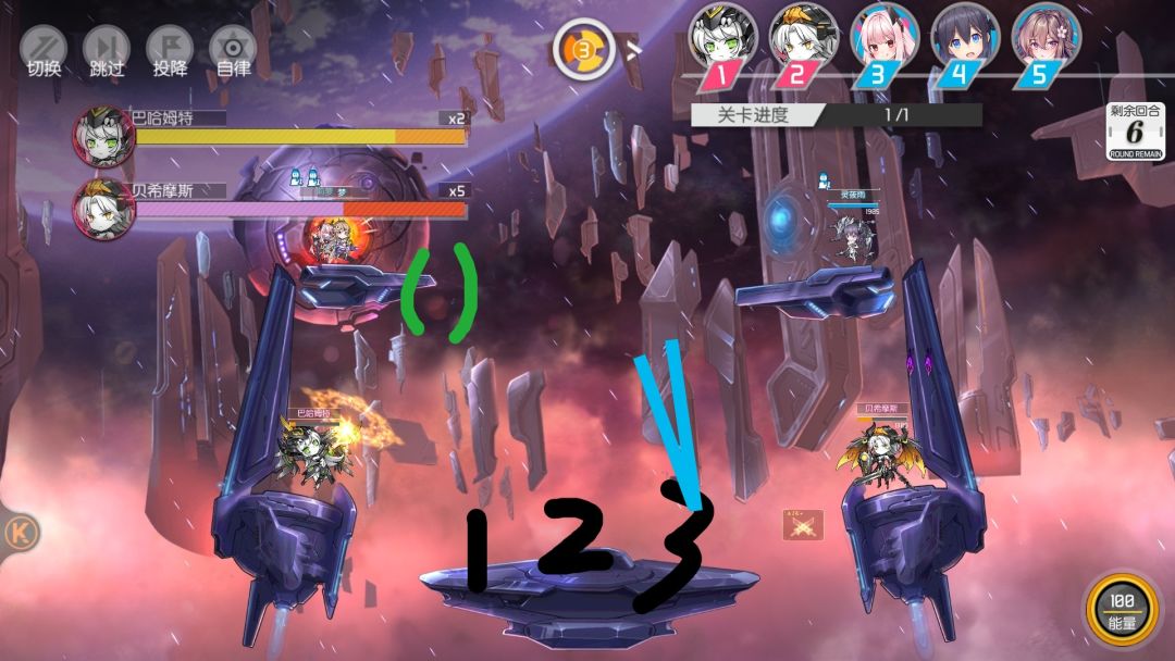 这是初始人物站位,由于我都第一个行动角色是3号,所以就用三号来举例