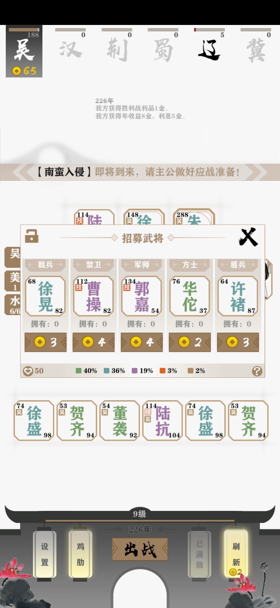 其次,前期如果四庭出来了就拿四庭过渡,大概到了赤壁之战的时候看自己手里是五子还是五谋的牌多,谁多就用谁,另外的果断卖掉,不然容易卡手。