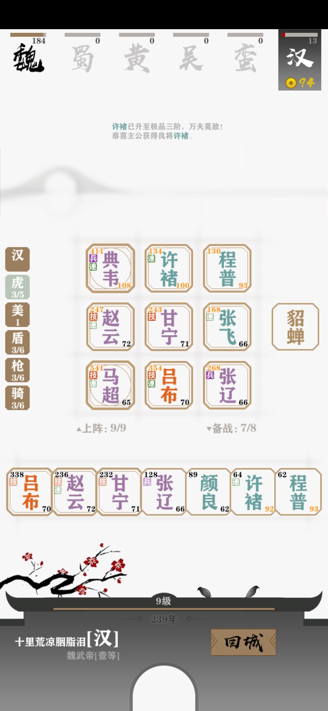 最后再推荐一下他们的美人搭配,个人觉得配合甄宓是很好的,可以给曹老板加暴击以及魏的加成(甄宓应该是魏)。同时要注意一定要吃鸡肋!鸡肋!鸡肋!不然不可能打过的(当然不用叠满,吃个十多年或者二十年基本就行了)