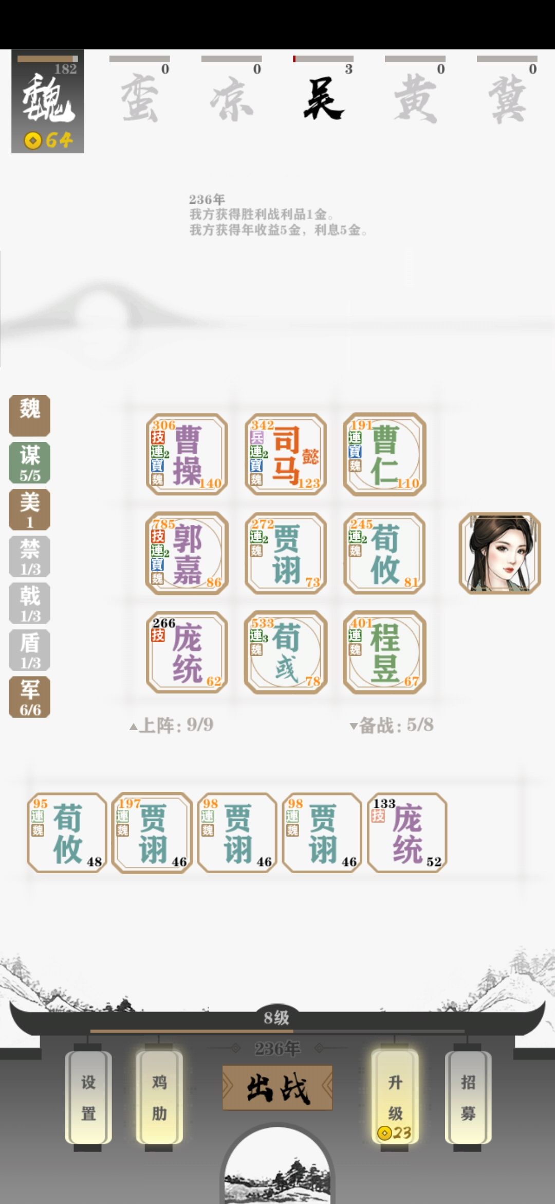 然后是五谋,五谋的话最好配庞统组六军,而不是诸葛,庞统的技能配合五谋的收益比诸葛的要高很多,至于前排,当然是曹老板与司马以及曹仁了(曹老板不说,连携加技能肉起来不比司马差,曹仁则是前期过渡并且是绿容易三阶)