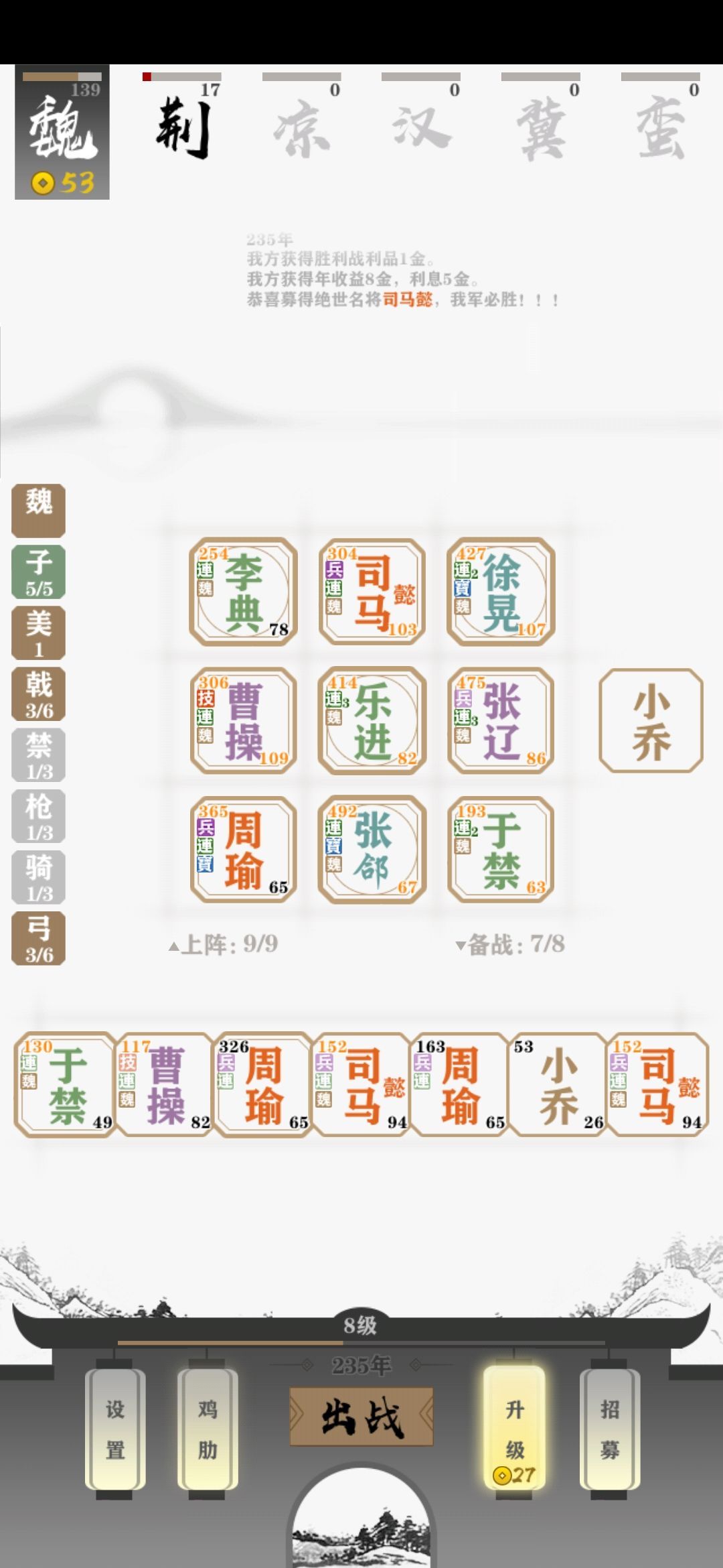 老规矩,开局最好有个水师 ,没有也别担心,后面会有的。然后就是无脑拿水师,不管是谁,拿就对了,感觉要打不过电脑了就升人口,水师,稳!
