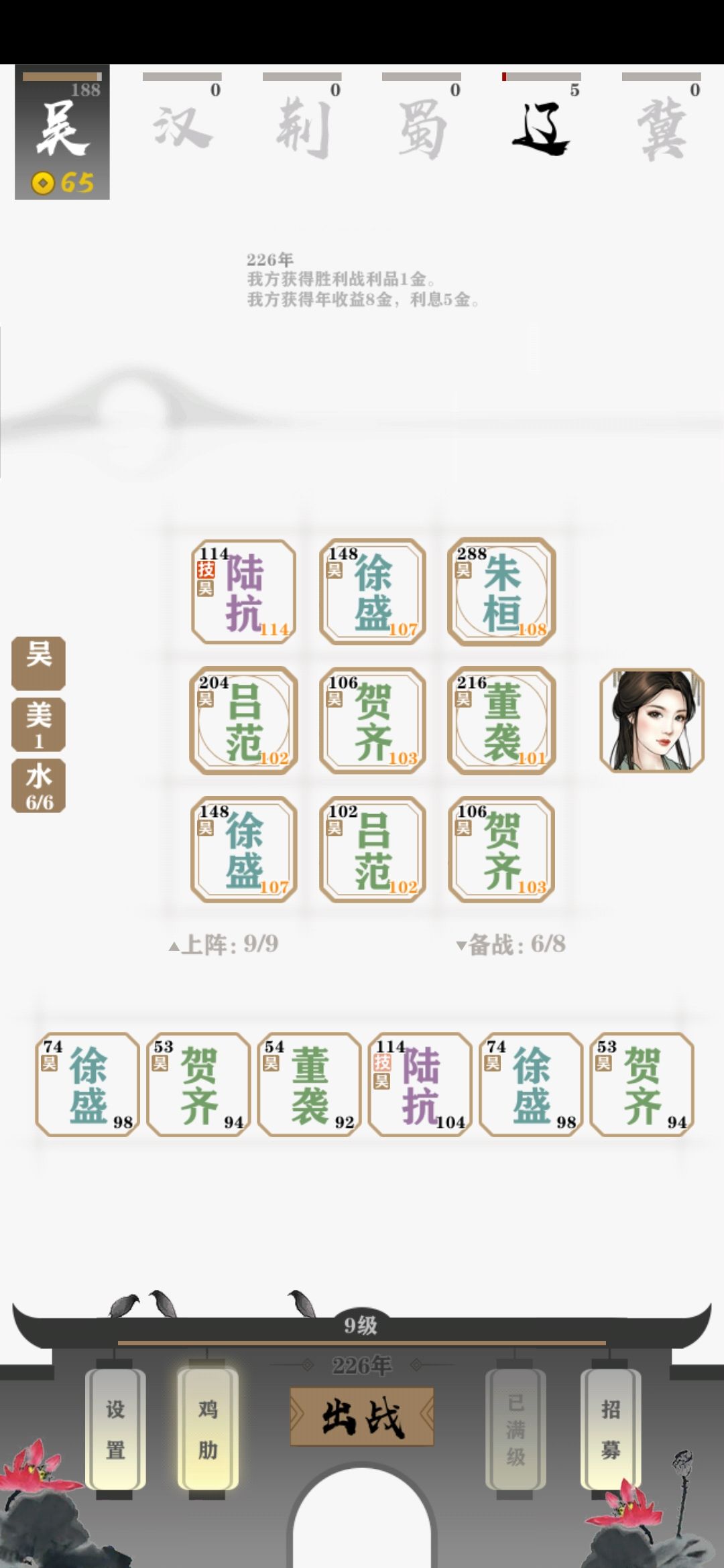 推荐搭配:(水师,要啥搭配,自己人就行)。后面就是多少人口就是多少水师啦╮(‵▽′)╭。美人推荐加防御的甄宓,或者加士兵的大乔。