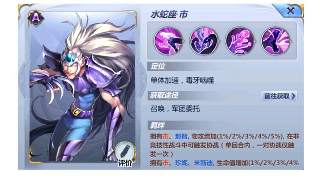 首先市的技能决定了他只能作为毒系组合而存在,而市本身中毒能力却不突出,所以需要其他小伙伴配合,游戏中目前版本有中毒能力的有还有三个,双鱼座阿布,蛇夫座沙尔娜,圣域勇士。圣域勇士虽然也有中毒技能且不消耗能量,但是初始114的速度并且只是C等级的材料卡所以并不推荐使用,双鱼座本身只有普攻附加一层中毒效果,并且还不是100%,而毒系毒系组合本身并不需要效果命中,所以只留下一个蛇夫座的沙尔娜与市组合。