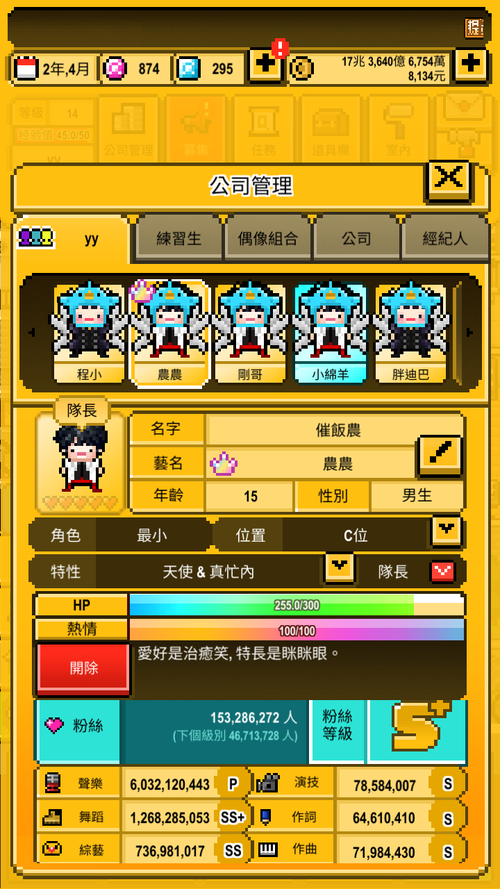 今天刚玩,试水中,最重要的是专辑,专辑各项选满然后最好搭配好,每次上排行榜都加粉丝这是最重要的来源。通告给的经验值/粉丝/钱都很少。基本上我是专辑加演唱会ˋ这样跑。PS,我是无良老板演唱会收益全我的,每次演唱会过后花个几亿安抚下他们就好,他们很知足很快乐(滑稽)